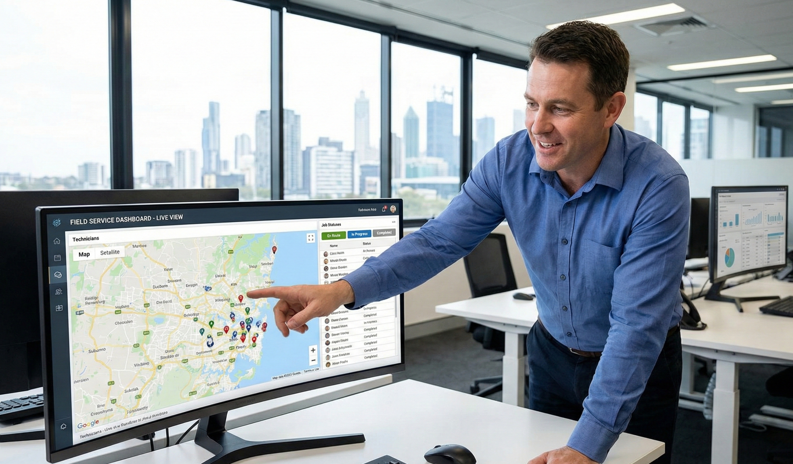 Dispatch software solves this. The Global Positioning System shows you exactly where all your field staff are. The software optimizes field routes automatically, factoring in traffic, job duration, and skills. What took 90 minutes now takes 15.